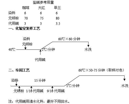 (2)、使用过程中出现个别颜色与原纯碱工艺有差异,属正常,可略调染料配方即可。因为代用碱的染色工艺微调了部分染料的上染机理,而这些微调的方向正是染色工作者所希望的。